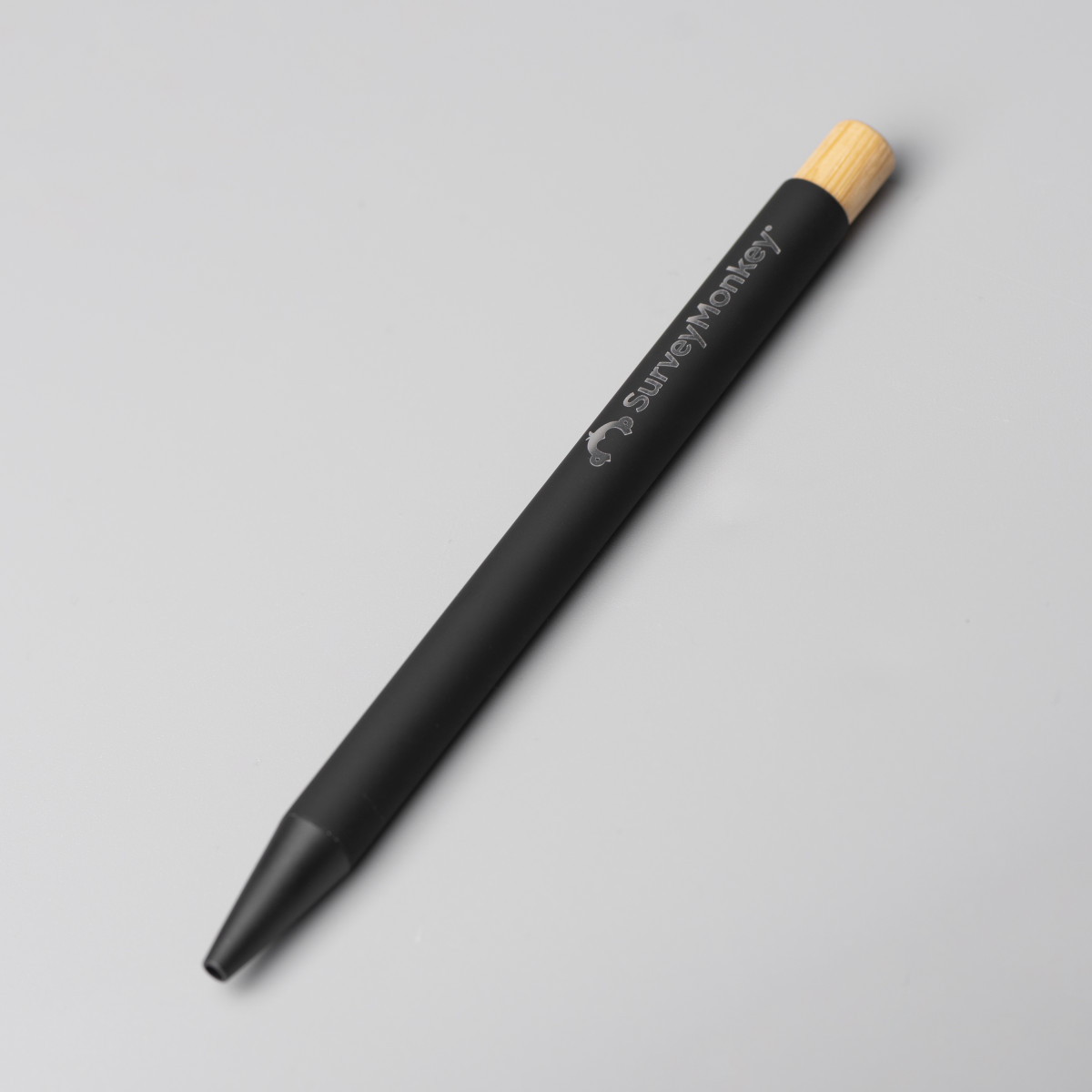 A stylish and sleek recycled-aluminum metal pen with a Bamboo push button on the top, making it eco-friendly and sustainable.