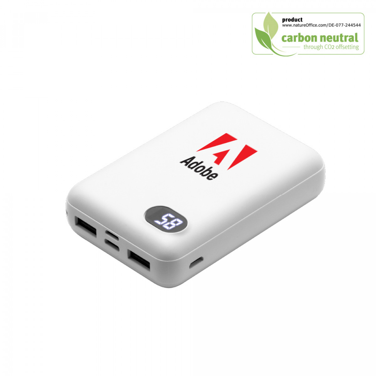 A portable and stylish 5000mAh power bank crafted from recycled aluminum and ABS plastic. Compact and customizable (brand logo printing on body).